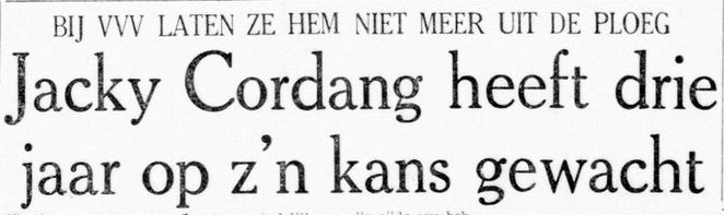 Natuurlijk was Jacky Cordang niet foutloos. Zo liet hij zich tijdens VVV - Fortuna ’54 (1-1) verrassen door André Ravenstein die een strafschop zacht inschoot, waar Cordang blijkbaar een poeier had verwacht. Maar over het algemeen keepte hij uitstekend. Aanleiding voor Het Nieuwsblad van het Zuiden om hem te interviewen. En, ja, hoor, daar verscheen op 23 maart 1959 een artikel onder de kop ‘Jack CORDANG kleinste doelman in de eredivisie’.